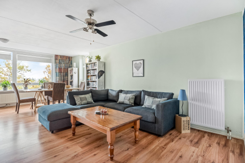 Bij binnenkomst in de woning valt direct de royale opzet op. De ruime woonkamer is bijzonder licht dankzij de grote ramen, die niet alleen zorgen voor veel natuurlijk licht, maar ook een fraai uitzicht bieden op de verzorgde achtertuin met veranda.